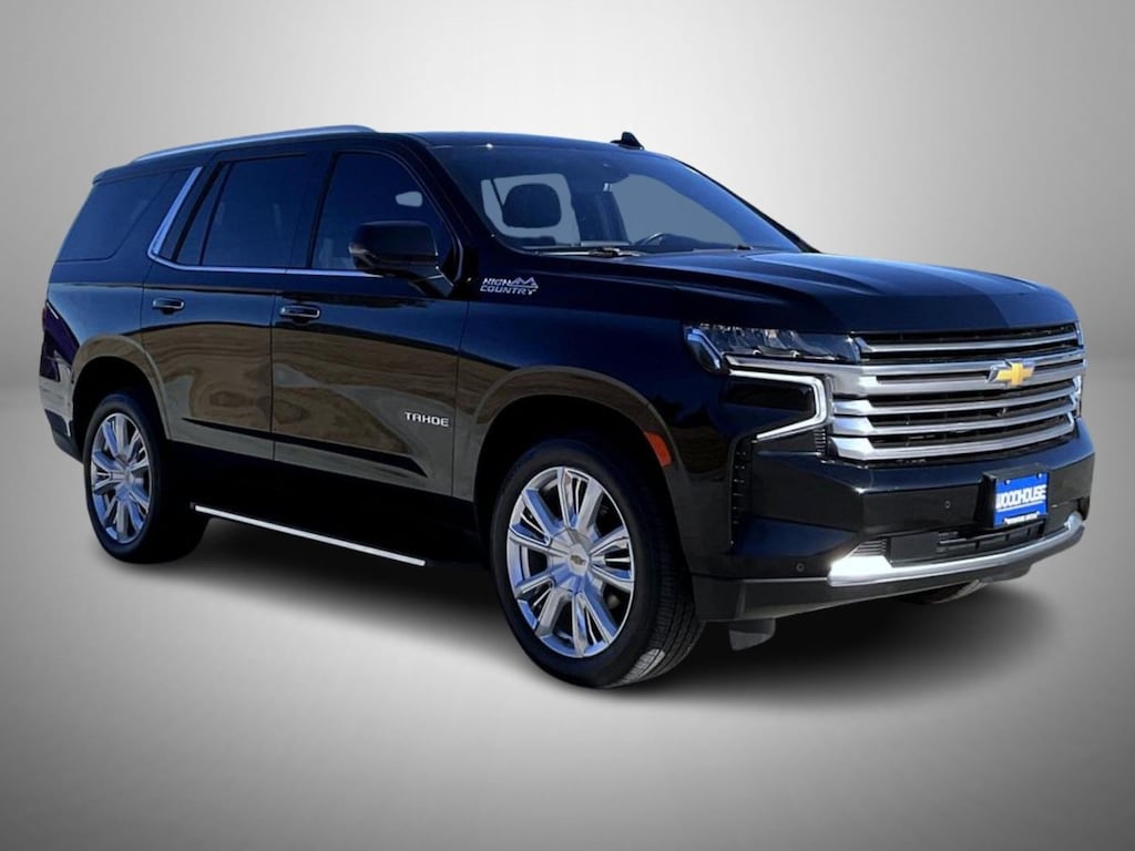 Black 2021 Chevrolet Tahoe High Country 4WD 10-Speed Automatic with Overdrive 6.2L V8 4WD, Jet Black Leather, 10 Speakers, 12-Way Power Driver & Passenger Seat Adjusters, 15" Diagonal Multi-Color Head-Up Display, 1st & 2nd Row Color-Keyed Carpeted Floor Mats, 2 USB Data Ports, 2-Speed Active Electronic AutoTrac Transfer Case, 3.23 Rear Axle Ratio, 3rd Row 60/40 Power-Folding Split-Bench Seat, 3rd row seats: split-bench, 4-Wheel Disc Brakes, ABS brakes, Adaptive Cruise Control, Adaptive suspension, Air Conditioning, Alloy wheels, AM/FM radio: SiriusXM with 360L, Apple CarPlay/Android Auto, Auto High-beam Headlights, Auto-dimming door mirrors, Auto-dimming Rear-View mirror, Auto-leveling suspension, Automatic Heated Steering Wheel, Automatic temperature control, Bose 10-Speaker Centerpoint Surround Audio Sys Ft, Brake assist, Bright Front & Rear Door Sill Plates, Bumpers: body-color, Chrome Door Handles w/Body-Color Strip, Color-Keyed Carpeting Floor Covering, Compass, Delay-off headlights, Driver & Front Outboard Passenger Airbags, Driver door bin, Driver vanity mirror, Dual Exhaust System, Dual front impact airbags, Dual front side impact airbags, Dual-Pane Power Panoramic Sunroof, Electronic Stability Control, Emergency communication system: OnStar and Chevrolet connected services capable, Enhanced Automatic Emergency Braking, Enhanced Driver Information Center, Floor Console, Floor Console w/Storage Area, Four wheel independent suspension, Front & Rear Park Assist, Front anti-roll bar, Front Bucket Seats, Front Center Armrest, Front dual zone A/C, Front High-Back Reclining Bucket Seats, Front reading lights, Fully automatic headlights, Garage door transmitter, Hands-Free Rear Power Programmable Liftgate, HD Radio, HD Surround Vision, Heads-Up Display, Heated & Ventilated Driver & Front Passenger Seats, Heated 2nd Row Outboard Seats, Heated door mirrors, Heated Driver & Front Passenger Seats, Heated front seats, Heated rear seats, Heated steering wheel, Hill Descent Control, Illuminated entry, Infotainment Display, Inside Rearview Auto-Dimming Rear Camera Mirror, Lane Change Alert w/Side Blind Zone Alert, Lane Keep Assist w/Lane Departure Warning, Leather steering wheel, Leather-Wrapped Steering Wheel, LED Daytime Running Lamps, License Plate Front Mounting Package, Low tire pressure warning, Magnetic Ride Control Suspension, Memory seat, Memory Settings, Navigation System, Not Equipped w/Automatic Stop/Start, Not Equipped w/Steering Column Lock, Not Equipped w/Wireless Charging, Occupant sensing airbag, Outside Heated Power-Adjustable Mirrors, Outside temperature display, Overhead airbag, Overhead console, Panic alarm, Passenger door bin, Passenger vanity mirror, Perforated Leather Seat Trim, Power door mirrors, Power driver seat, Power Liftgate, Power passenger seat, Power Release 2nd Row Bucket Seats, Power steering, Power Tilt & Telescopic Steering Column, Power windows, Preferred Equipment Group 3LZ, Premium audio system: Chevrolet Infotainment 3, Radio: Chevrolet Infotainment 3 Premium System, Rain sensing wipers, Rear air conditioning, Rear anti-roll bar, Rear Camera Mirror Washer, Rear Cross Traffic Alert, Rear Pedestrian Alert, Rear reading lights, Rear window defroster, Rear window wiper, Remote keyless entry, Remote Start, Roof rack: rails only, Safety Alert Seat, Security system, Set of 4 Wheel Locks (LPO), SiriusXM NavTraffic, SiriusXM Radio w/360L, Speed control, Speed-sensing steering, Split folding rear seat, Spoiler, Steering wheel memory, Steering wheel mounted audio controls, Tachometer, Telescoping steering wheel, Tilt steering wheel, Traction control, Trip computer, Turn signal indicator mirrors, Universal Home Remote, Variably intermittent wipers, Ventilated front seats, Voltmeter, Wheels: 22" x 9" Sterling Silver Premium Painted, 4WD, Jet Black Leather.