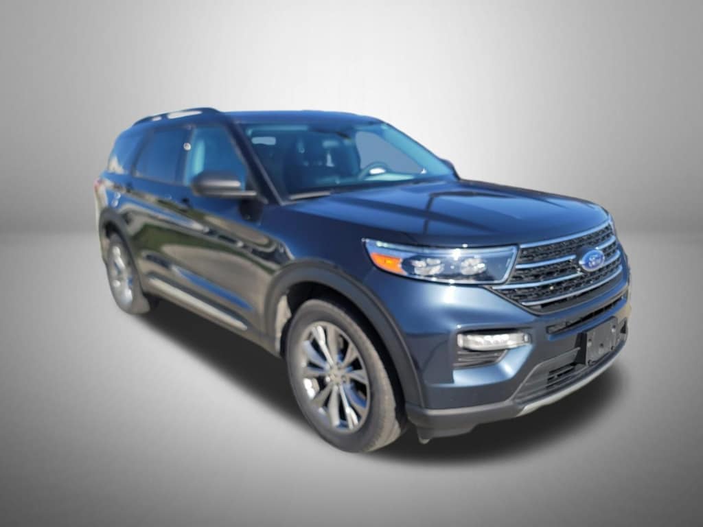 Blue Metallic 2022 Ford Explorer XLT 4WD 10-Speed Automatic 4 cylinder 4WD, 1st Row Heated Seats, 20" Premium Painted Aluminum Wheels, 3.58 Non-Limited-Slip Rear Axle Ratio, 3rd row seats: bench, 4-Wheel Disc Brakes, 6 Speakers, ABS brakes, Acoustic-Laminated Front Side Windows, ActiveX Captain's Chairs, Air Conditioning, Alloy wheels, AM/FM radio: SiriusXM, AM/FM Stereo, Auto High-beam Headlights, Auto Start-Stop Removal, Automatic temperature control, Brake assist, Bumpers: body-color, Class IV Trailer Tow Package, Compass, Delay-off headlights, Driver door bin, Driver vanity mirror, Dual front impact airbags, Dual front side impact airbags, Electronic Stability Control, Emergency communication system: SYNC 3 911 Assist, Equipment Group 202A, Evasive Steering Assist, Exterior Parking Camera Rear, Ford Co-Pilot360 Assist+, FordPass Connect, Four wheel independent suspension, Front anti-roll bar, Front Bucket Seats, Front Center Armrest, Front dual zone A/C, Front License Plate Bracket, Front reading lights, Fully automatic headlights, Heated door mirrors, Heated front seats, Heated Steering Wheel, Illuminated entry, Intelligent Adaptive Cruise Control, Knee airbag, Leather steering wheel, LED Fog Lamps, Low tire pressure warning, Occupant sensing airbag, Outside temperature display, Overhead airbag, Overhead console, Panic alarm, Passenger door bin, Passenger vanity mirror, Power door mirrors, Power driver seat, Power Liftgate, Power passenger seat, Power steering, Power windows, Rear air conditioning, Rear anti-roll bar, Rear Auxiliary Controls Credit, Rear reading lights, Rear window defroster, Rear window wiper, Remote keyless entry, Remote Start System, Roof rack: rails only, SecuriCode Keyless Entry Keypad, Security system, Speed control, Speed Sign Recognition, Speed-sensing steering, Speed-Sensitive Wipers, Split folding rear seat, Spoiler, Steering wheel mounted audio controls, SYNC 3 Communications & Entertainment System, SYNC 3/Apple CarPlay/Android Auto, Tachometer, Telescoping steering wheel, Tilt steering wheel, Traction control, Trip computer, Unique Cloth Captain's Chairs, Variably intermittent wipers, Voice-Activated Touchscreen Navigation System, Wheels: 18" 5-Spoke Silver-Painted Aluminum, 4WD.