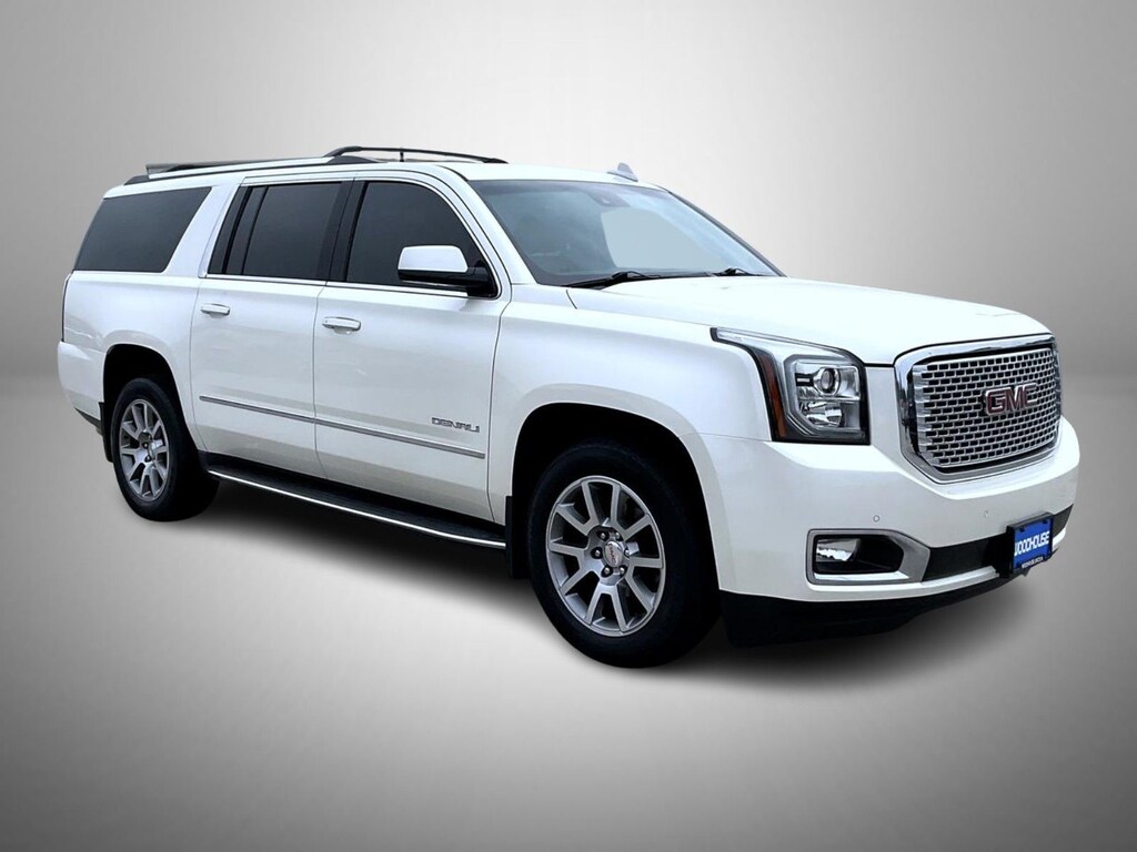 White Diamond Tricoat 2015 GMC Yukon XL Denali 4WD 8-Speed Automatic 6.2L V8 4WD, 10 Speakers, 3.23 Axle Ratio, 3rd Row DVD Screen, 3rd row seats: split-bench, 4-Wheel Disc Brakes, 5 Auxiliary 12-volt Power Outlets, ABS brakes, Adjustable pedals, Air Conditioning, Alloy wheels, AM/FM radio: SiriusXM, Auto-dimming door mirrors, Auto-dimming Rear-View mirror, Automatic temperature control, Black Assist Steps w/Chrome Strip, Black Roof Rack Cross Rails, Bodyside moldings, Bose Centerpoint Surround Sound 10 Speaker System, Brake assist, Bumpers: body-color, CD player, Color-Keyed Heated Leather-Wrapped Steering Wheel, Compass, Delay-off headlights, Driver Alert Package, Driver door bin, Driver vanity mirror, Dual front impact airbags, Dual front side impact airbags, Electronic Stability Control, Emergency communication system, Exterior Parking Camera Rear, Front anti-roll bar, Front Bucket Seats, Front Center Armrest, Front dual zone A/C, Front fog lights, Front reading lights, Front wheel independent suspension, Fully automatic headlights, Garage door transmitter, Genuine wood console insert, Genuine wood dashboard insert, Genuine wood door panel insert, Hands Free Power Liftgate, Heated & Cooled Full-Feature Reclining Bucket Seats, Heated door mirrors, Heated front seats, Heated rear seats, Heated steering wheel, High-Intensity Discharge Headlights, Illuminated entry, Inside Rear-View Auto-Dimming Mirror, Integrated Trailer Brake Controller, Leather Shift Knob, License Plate Front Mounting Package, Low tire pressure warning, Magnetic Ride Control Suspension Package, Memory Package, Memory seat, Molded Splash Guards, Navigation System, Occupant sensing airbag, OnStar Basic Plan For 5 Years, OnStar w/4G LTE, Open Road Package, Outside temperature display, Overhead airbag, Overhead console, Panic alarm, Passenger door bin, Passenger vanity mirror, Passive Entry System, Pedal memory, Perforated Leather-Appointed Seat Trim, Polished Exhaust Tips, Power door mirrors, Power driver seat, Power Liftgate, Power passenger seat, Power Rear Liftgate, Power Second Row Bucket Seats, Power steering, Power Tilt & Telescopic Steering Column, Power Tilt-Sliding Sunroof w/Express-Open/Close, Power windows, Power-Adjustable Pedals For Accelerator & Brake, Preferred Equipment Group 5SA, Premium audio system: IntelliLink, Push Button Keyless Start, Radio: AM/FM/SiriusXM/HD w/Navigation, Rain sensing wipers, Rear air conditioning, Rear anti-roll bar, Rear Cross-Traffic Alert, Rear reading lights, Rear Seat Blu-Ray/DVD Entertainment System, Rear window defroster, Rear window wiper, Remote Keyless Entry, Remote keyless entry, Roof rack: rails only, Safety Alert Seat, Security system, Side Blind Zone Alert w/Lane Change Alert, Speed control, Speed-sensing steering, Split folding rear seat, Spoiler, Steering wheel memory, Steering wheel mounted audio controls, Tachometer, Telescoping steering wheel, Tilt steering wheel, Traction control, Trip computer, Turn signal indicator mirrors, Universal Home Remote, Variably intermittent wipers, Ventilated front seats, Voltmeter, Wheels: 20" x 9" Ultra Bright Machined Aluminum, Wireless Charging, 4WD.